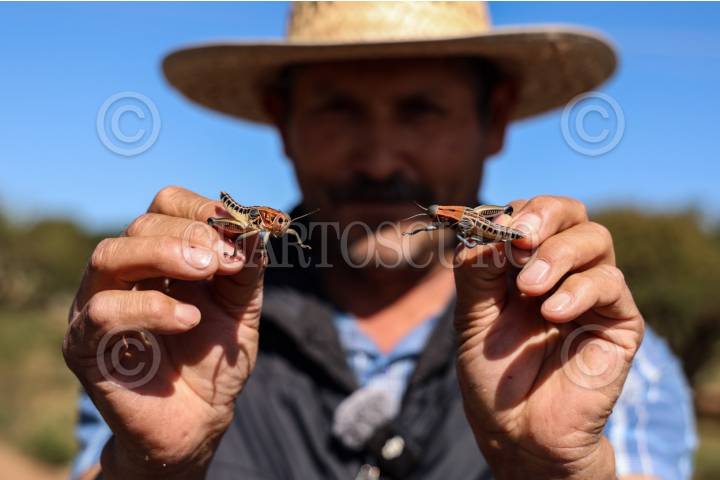 FRESNILLO, ZACATECAS, 12AGOSTO2025.- Más de doce mil hectáreas de producción agrícola en alrededor de siente municipios han sido afectadas por la plaga del chapulín. Pequeños agricultores, principalmente de frijol y maíz, han solicitado apoyo con insecticidas para contener el avance de los insectos, los cuales aparecieron con las primeras lluvias. El Comité Estatal de Sanidad Vegetal de Zacatecas, ha entregado a productores insecticida Malathion, además de asistencia técnica para que se siga aplicando principalmente en los municipios donde se concentra la mayor cantidad de chapulines: Villanueva, Guadalupe, Fresnillo, Jerez, Jiménez del Teúl, Valparaíso y Genaro Codina. FOTO: ADOLFO VLADIMIR /CUARTOSCURO.COM