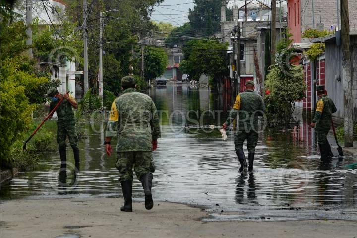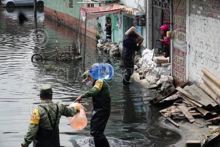 CHALCO, ESTADO DE MÉXICO, 22AGOSTO2024.- Elementos del Ejercito Mexicano han implementado el Plano DN -III-E, en las calles inundandas por aguas negras y pluviales de las colonias Jacalones y Culturas Mexicanas, condición que ya cumple 21 días. Los soldados recorrieron por las casas para entregar víveres, agua, transportar personas que necesitaban salir de sus casas y atención médica, además se han sumado a los trabajos de desazolve. FOTO: ROGELIO MORALES/CUARTOSCURO.COM