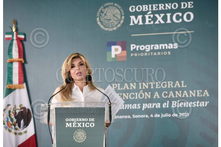 Claudia Artemiza Pavlovich Arellano durante la visita del presidente Andrés Manuel López Obrador para anunciar el Plan Intefral de Atención a Cananea en Sonora