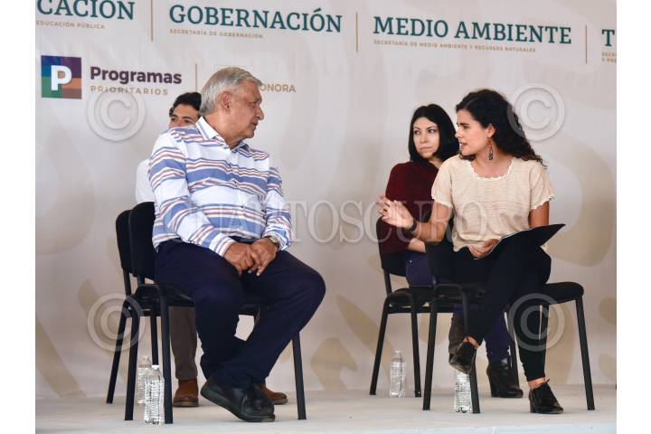 El presidente Andrés Manuel López Obrador y Luisa María Alcalde conversan durante el anuncio del Plan Intefral de Atención a Cananea en Sonora
