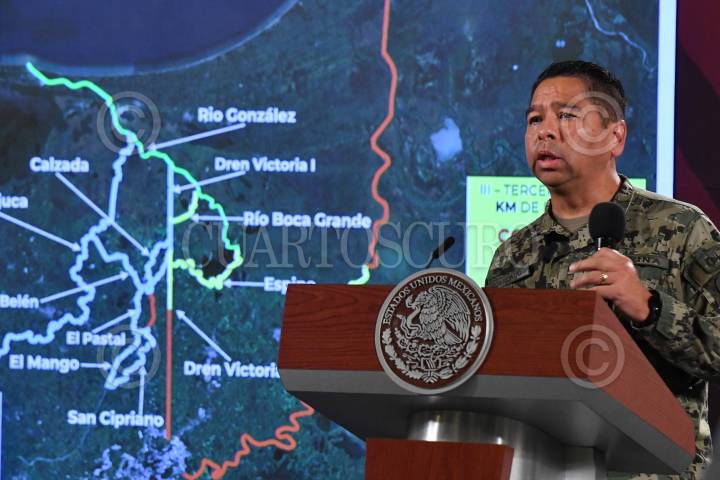 CIUDAD DE MÉXICO, 08AGOSTO2024.- Javier Guardado Morado, director general de Dragado de la Secretaría de Marina, durante la conferencia matutina en Palacio Nacional, expone el plan integral de dragado en Tabasco. FOTO: MARIO JASSO/CUARTOSCURO.COM