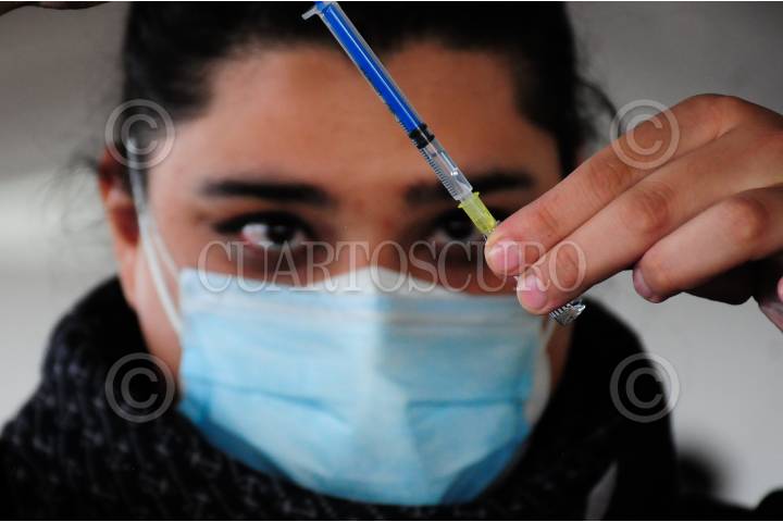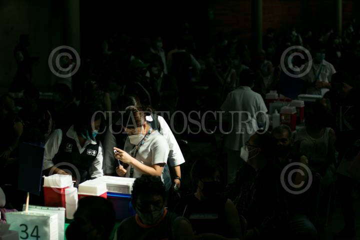 Un grupo de enfermeras preparan una dosis de la vacuna Pfizer que será aplicada a personas de 50-59 años en la Biblioteca Vasconcelos, alcaldía Cuauhtémoc, contra la Covid-19.