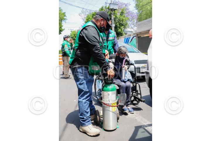 Una mujer llega a un centro de vacunación contra el Covid-19 apoyada por un tanque de oxígeno.