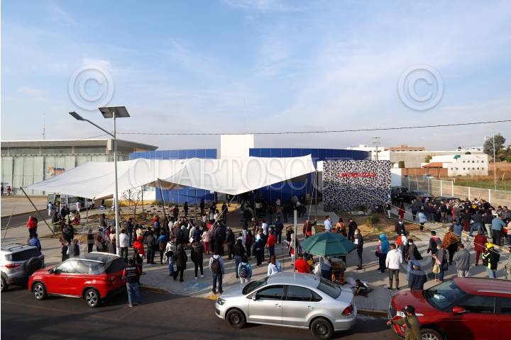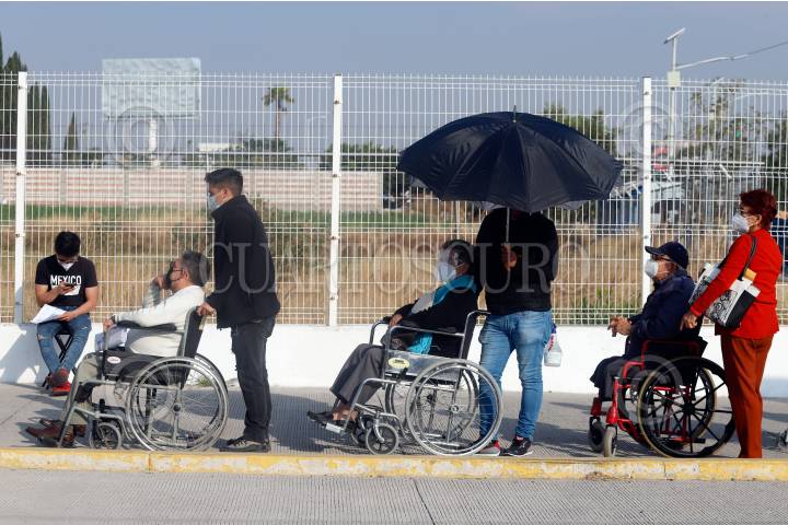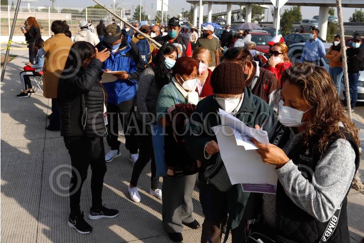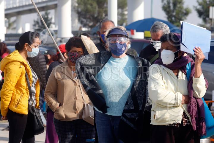 Adultos mayores de Puebla acuden al Cessa para recibir la segunda dosis de la vacuna contra Covid-19.