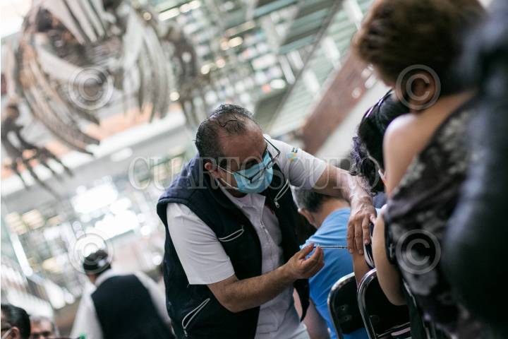 Aplicación de la vacuna contra el Covid-19 en un adulto mayor de la Alcaldía Iztapalapa.