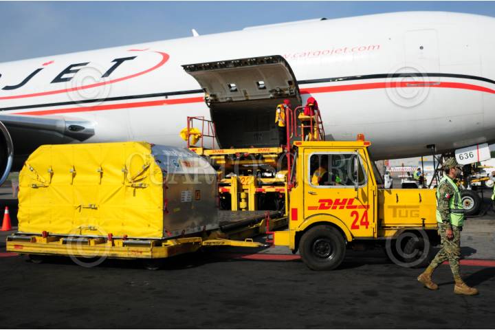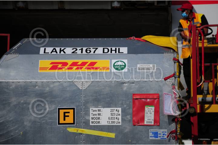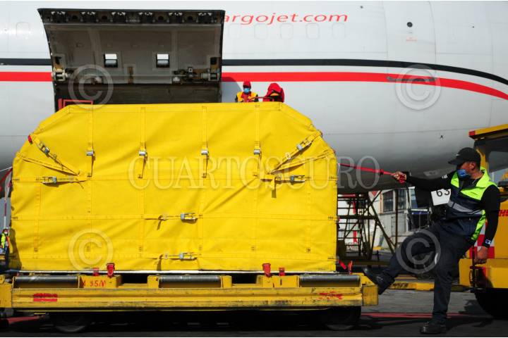 Trabajadores del aeropuerto maniobran con el cargamento de las vacunas contra el Covid-19.