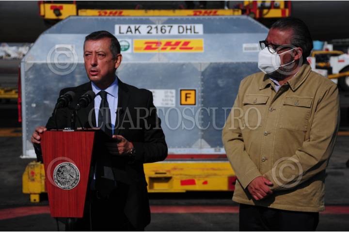 Pedro Zenteno, director de Birmex y Horacio Duarte, titular de Aduanas, recibieron el cargamento de las vacunas contra el Covid-19.
