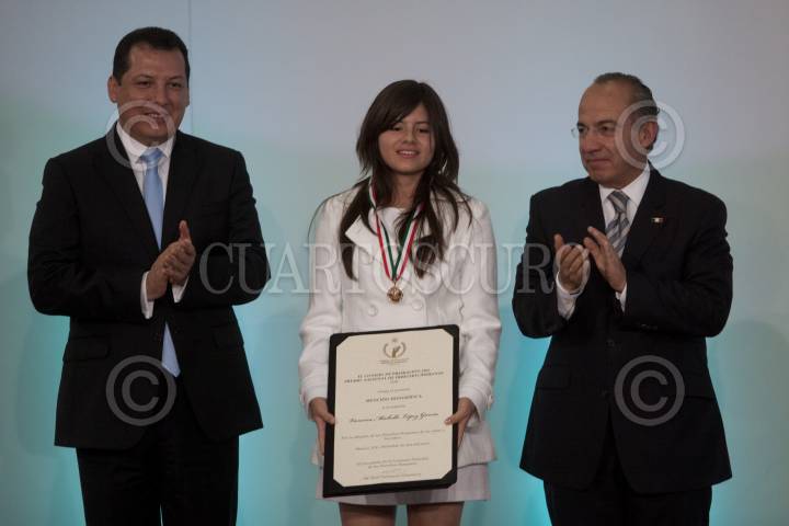 MÉXICO, D.F., 09DICIEMBRE2011.- Raúl Plascencia Villanueva, Presidente de la Comisión Nacional de Derechos Humanos y Felipe Calderón Hinojosa, Presidente de México, entregaron mención especial a la joven Vanessa Michelle López García, por su promoción a la protección de los derechos humanos; esto durante la entrega del Premio Nacional de Derechos Humanos 2011. FOTO: ADOLFO VLADIMIR/CUARTOSCURO.COM