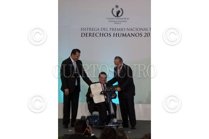 MÉXICO, D.F., 09DICIEMBRE2011.- Raúl Plascencia Villanueva, Presidente de la Comisión Nacional de Derechos Humanos y Felipe Calderón Hinojosa, Presidente de México, entregaron el Premio Nacional de Derechos Humanos 2011 a Federico Manuel Fleischmann Loredo, por su trabajo en la protección de los derechos de las personas con capacidades diferentes. FOTO: ADOLFO VLADIMIR/CUARTOSCURO.COM