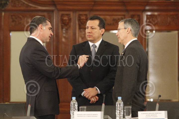 MÉXICO, D.F., 16DICIEMBRE2011.- Gabino Cué Monteagudo, gobernador de Oaxaca, Raúl Plascencia Villanueva, presidente de la Comisión Nacional de Derechos Humanos, y José González Morfín, presidente de la mesa directiva del Senado, durante los trabajos de la primera sesión extraordinaria del Consejo Nacional de Seguridad Pública, en el Palacio Nacional. FOTO: MOISÉS PABLO/CUARTOSCURO.COM