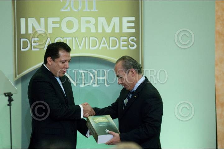 MÉXICO, D.F., 03FEBRERO2012.- El Presidente de la Comisión Nacional de Derechos Humanos, Raúl Plascencia Villanueva entregó su informe de labores 2011, en la residencia oficial de Los Pinos al Presidente de la República, Felipe Calderón Hinojosa. FOTO: FRANCISCO RODRÍGUEZ/CUARTOSCURO.COM