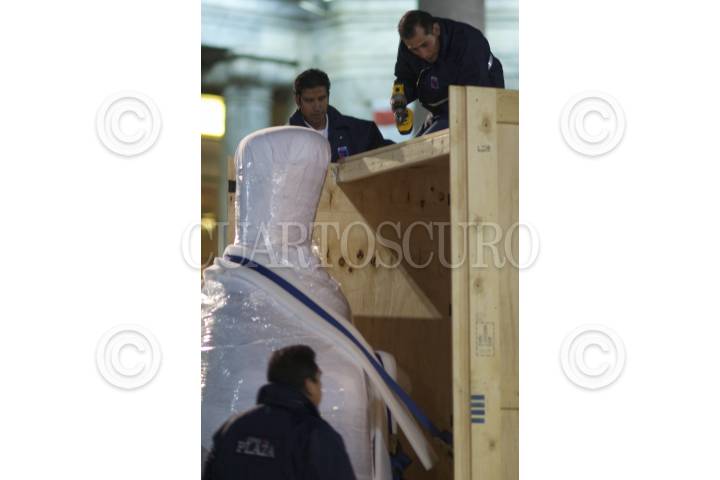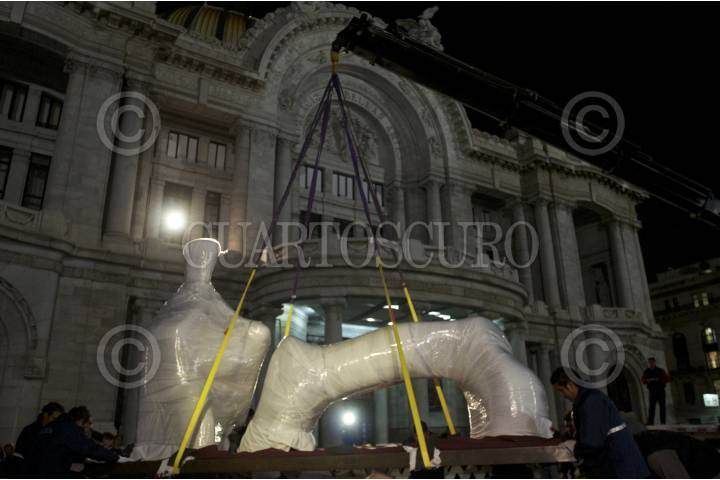 MÉXICO D.F., 21AGOSTO014.- Montaje de la escultura Reclining Figure: Arch Leg del artista británico Henry Moore, obra que forma parte de la exhibición En esto ver aquello. Octavio Paz y el arte en la explanada del Palacio de Bellas Artes. FOTO: IVÁN STEPHENS /CUARTOSCURO.COM