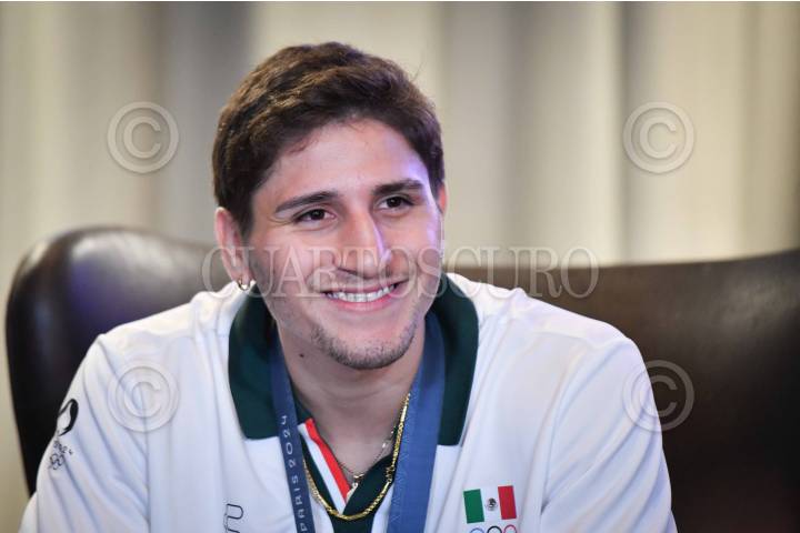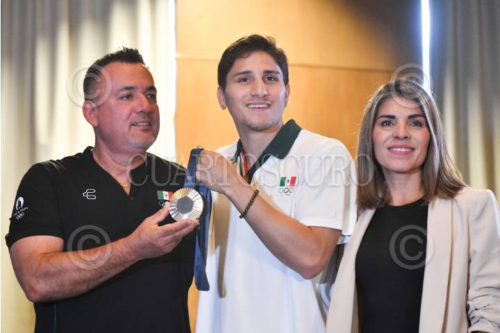 CIUDAD DE MÉXICO, 13AGOSTO2024.- Marco Alonso Verde, boxeador mexicano y ganador de la medalla de plata en las Olimpiadas de París 2024, ofreció conferencia de prensa para compartir con los medios de comunicación su experiencia en la justa deportiva internacional. Lo acompañan su entrenador Radamés Hernández, y su madre Fabiola Álvarez. FOTO: MARIO JASSO/CUARTOSCURO.COM