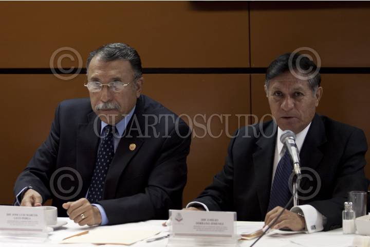 MÉXICO, D.F., 19ENERO2012.- Los diputados José Luis Marcos León y Emilio Serrano durante una reunión de trabajo en donde hablaron sobre el caso de la guardería ABC y el chiste del cómico Platanito en la Cámara de Diputados. FOTO: RODOLFO ANGULO/CUARTOSCURO.COM