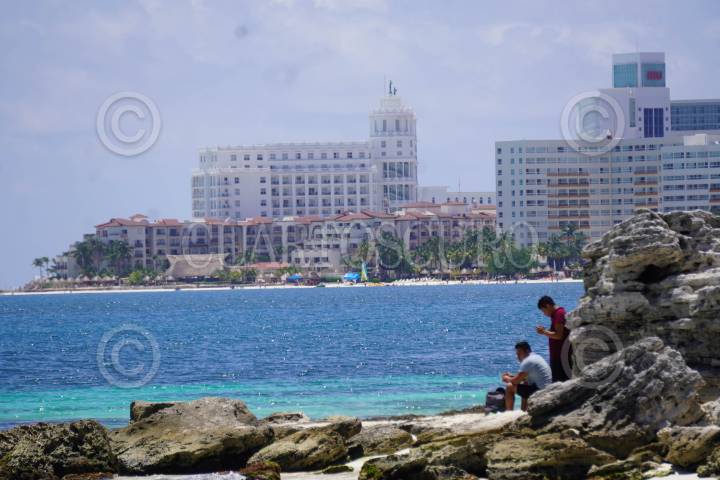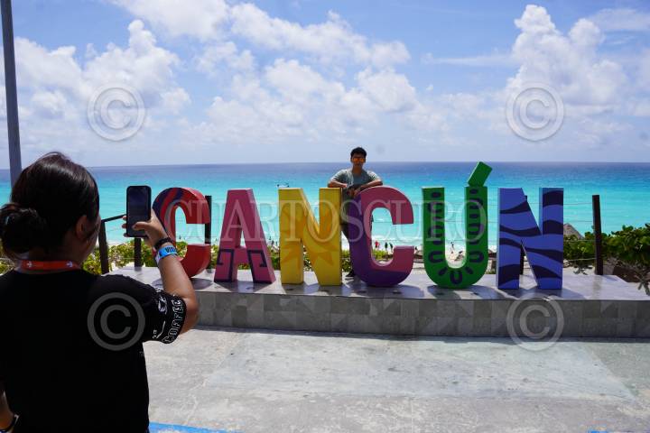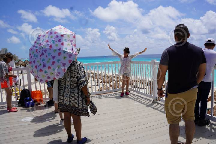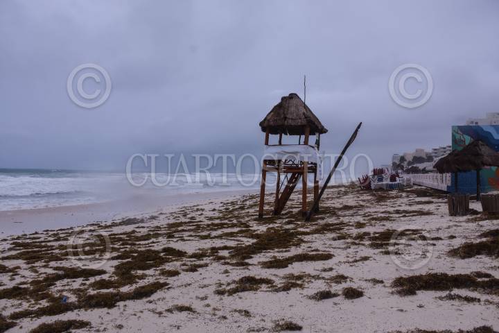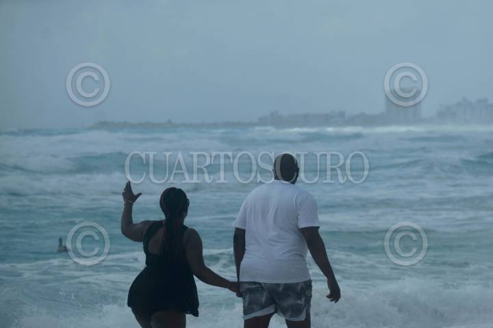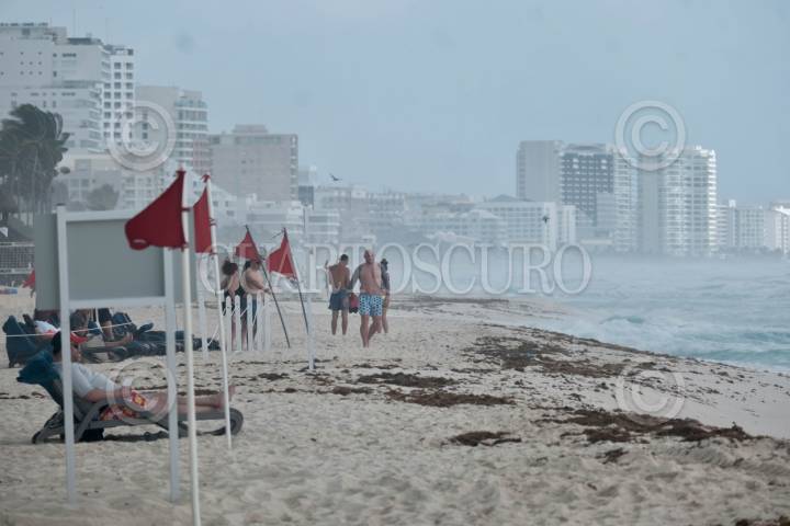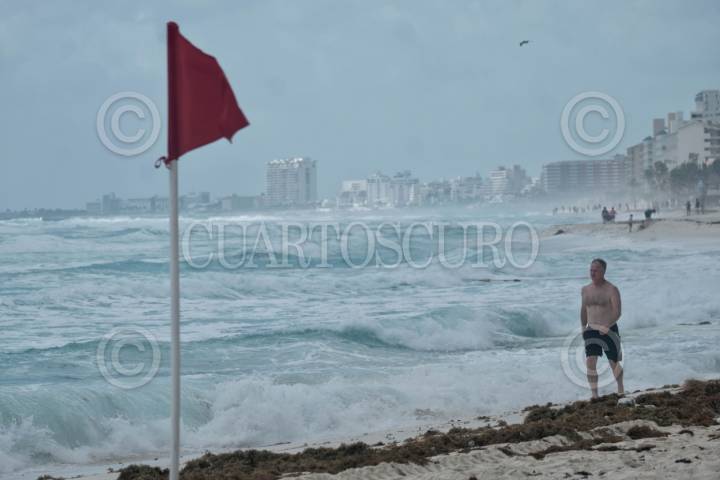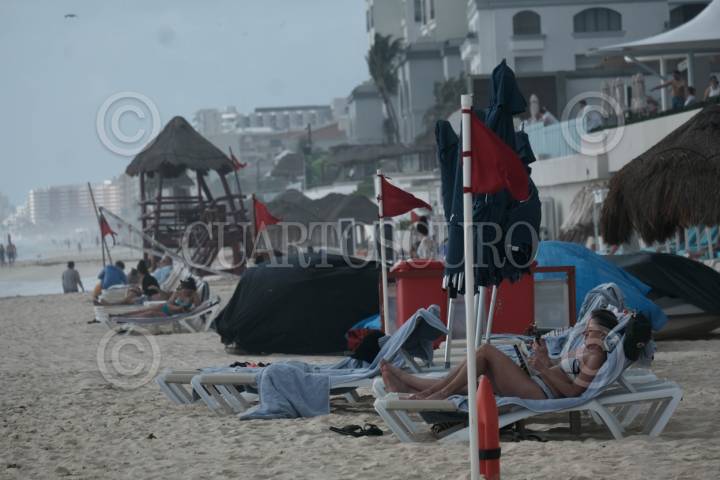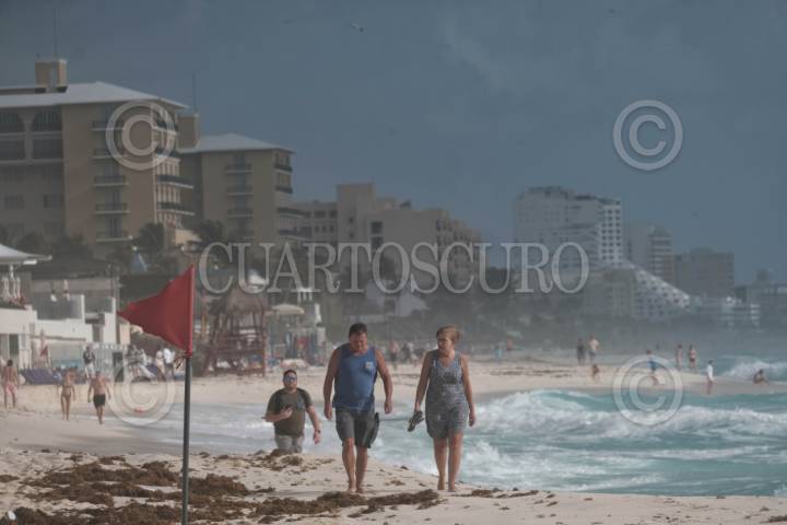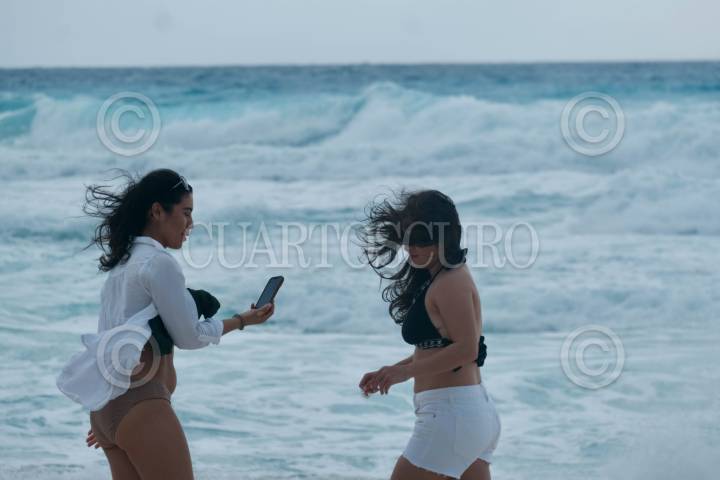 CANCÚN, QUINTANA ROO, 11FEBRERO2024.- Cielo nublado y fuertes vientos producto de una "Surada" se observan en Playa Delfines, en donde a pesar del clima los turistas aprovechan el tiempo para pasar a las orillas de las playas, ya que no se pueden mete al mar porque hay bandera roja por el fuerte oleaje. FOTO: ELIZABETH RUIZ/CUARTOSCURO.COM