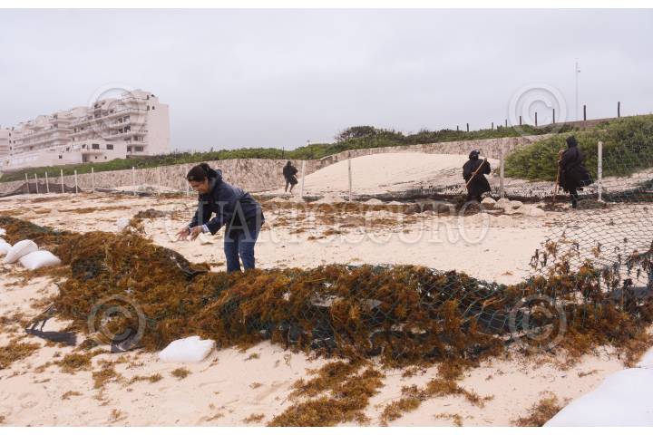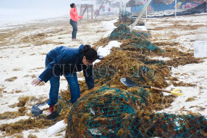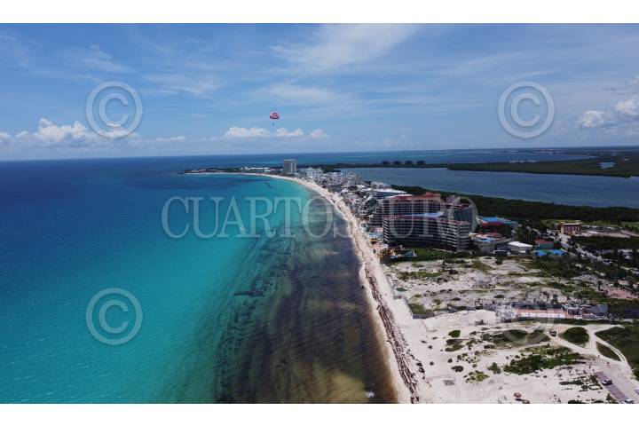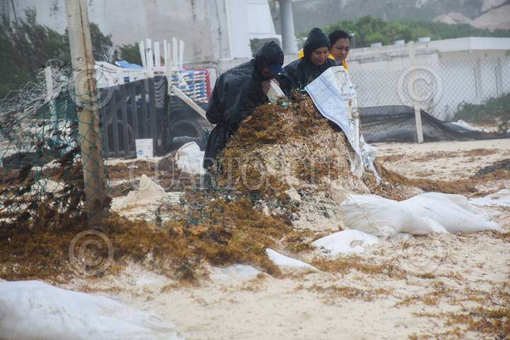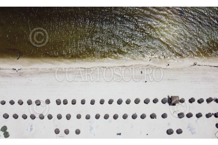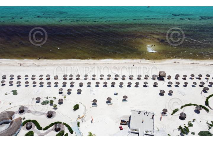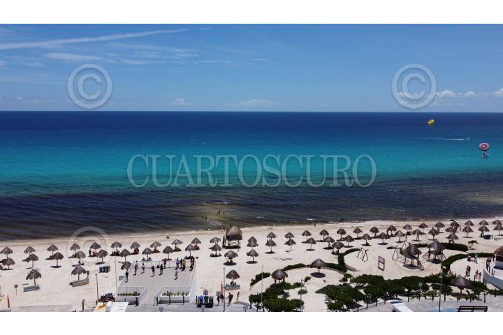 Una enorme mancha de sargazo se observa a todo lo largo de Playa de Delfines, en Cancún.