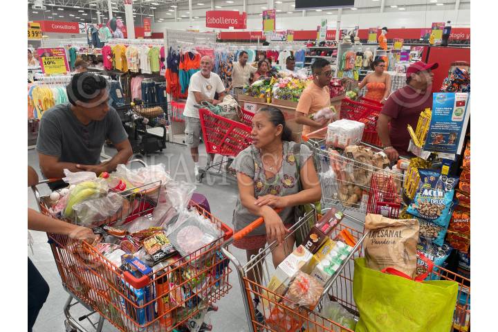 CANCÚN, QUINTANA ROO, 02JULIO2024.- Los residentes de Cancún continúan haciendo compras de víveres en Centros Comerciales esto ante el anuncio de que probablemente el jueves el huracán Beryl toque el sureste mexicano. Esto contrasta con los turistas nacionales que aprovechan el clima en Playa Delfines, que si bien un poco nubosa aun es agradable para el esparcimiento. FOTO: ELIZABETH RUIZ/CUARTOSCURO.COM