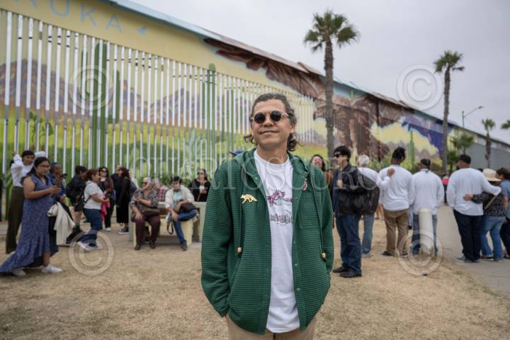 TIJUANA, BAJA CALIFORNIA 19JULIO2025.-Alfredo Libre Gutiérrez, artista principal de la obra. Con danza mexica y participación de comunidades indígenas, se inauguró el mural “Abrazo Mutuo” en el Parque de la Amistad, en Playas de Tijuana. La obra, liderada por el artista Alfredo Libre Gutiérrez, mide alrededor de 60 metros de largo y simboliza la unión entre el Norte y el Sur del continente, inspirada en la profecía del Águila y el Cóndor. Pintado por un colectivo de 10 artistas, incluidos miembros de la comunidad Kumiai, el mural mezcla paisajes, símbolos y flora local. Financiado por una fundación de Los Ángeles, busca promover la paz, el arte urbano y la identidad fronteriza. FOTO OMAR MARTÍNEZ / CUARTOSCURO.COM