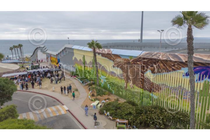 TIJUANA, BAJA CALIFORNIA 19JULIO2025.-Vista panorámica del Mural Abrazo Mutuo. Con danza mexica y participación de comunidades indígenas, se inauguró el mural “Abrazo Mutuo” en el Parque de la Amistad, en Playas de Tijuana. La obra, liderada por el artista Alfredo Libre Gutiérrez, mide alrededor de 60 metros de largo y simboliza la unión entre el Norte y el Sur del continente, inspirada en la profecía del Águila y el Cóndor. Pintado por un colectivo de 10 artistas, incluidos miembros de la comunidad Kumiai, el mural mezcla paisajes, símbolos y flora local. Financiado por una fundación de Los Ángeles, busca promover la paz, el arte urbano y la identidad fronteriza. FOTO OMAR MARTÍNEZ / CUARTOSCURO.COM