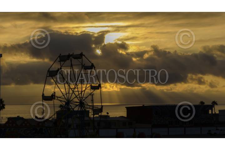 TIJUANA, BAJA CALIFORNIA, 21 JULIO 2025.- Atardecer visto desde el malecón de Playas de Tijuana, lugar al que acuden personas a pasear, hacer ejercicio y observar el entorno. En la imagen una rueda de la fortuna. FOTO: OMAR MARTÍNEZ / CUARTOSCURO.COM