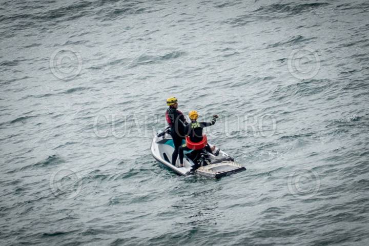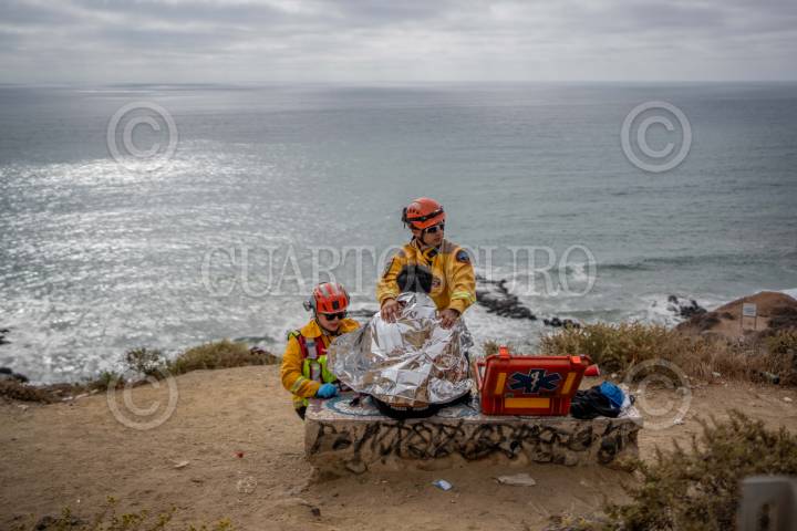 TIJUANA BAJA CALIFORNIA 1AGOSTO2025.-Un joven de aproximadamente 22 años fue rescatado por la unidad de rescate acuático de Bomberos Tijuana, luego de caer al mar desde un acantilado en la zona del mirador La Joya mientras pescaba. Al llegar al sitio, los rescatistas lo encontraron sobre una roca, luchando por no ser arrastrado por las olas. En el operativo participaron 10 bomberos, 5 salvavidas y 2 rescatistas en moto acuática. El hombre fue valorado por paramédicos de la Cruz Roja, sin requerir traslado hospitalario. FOTO CHRIS NOYOLA / CUARTOSCURO.COM