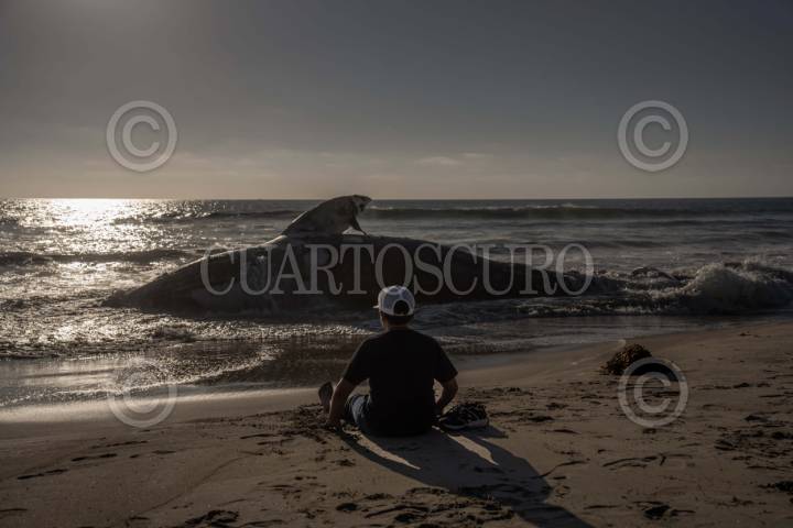 TIJUANA BAJA CALIFORNIA 18AGOSTO2025.- Niño sentado frente al cuerpo de la ballena sin vida. El cuerpo de una ballena fue hallada en la orilla de Playas de Tijuana, la tarde del lunes 18 de agosto cerca de la Estación de Salvavidas #14 en las inmediaciones del fraccionamiento La Perla. El hallazgo generó sorpresa entre las personas que se encontraban en la playa, quienes se acercaron para tomar fotos y videos. Autoridades municipales informaron la activación del protocolo para mamíferos marinos varados en coordinación con La Procuraduría Federal del Protección al Ambiente. (PROFEPA). FOTO: OMAR MARTÍNEZ/ CUARTOSCURO.COM