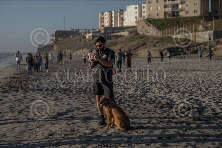 TIJUANA BAJA CALIFORNIA 18AGOSTO2025.- Hombre tomando una fotografía con su teléfono junto a un perro. El cuerpo de una ballena fue hallada en la orilla de Playas de Tijuana, la tarde del lunes 18 de agosto cerca de la Estación de Salvavidas #14 en las inmediaciones del fraccionamiento La Perla. El hallazgo generó sorpresa entre las personas que se encontraban en la playa, quienes se acercaron para tomar fotos y videos. Autoridades municipales informaron la activación del protocolo para mamíferos marinos varados en coordinación con La Procuraduría Federal del Protección al Ambiente. (PROFEPA). FOTO: OMAR MARTÍNEZ/ CUARTOSCURO.COM