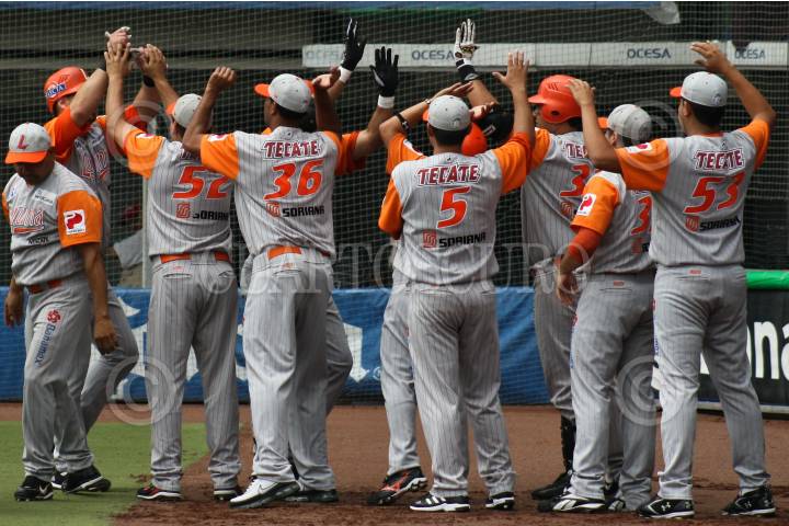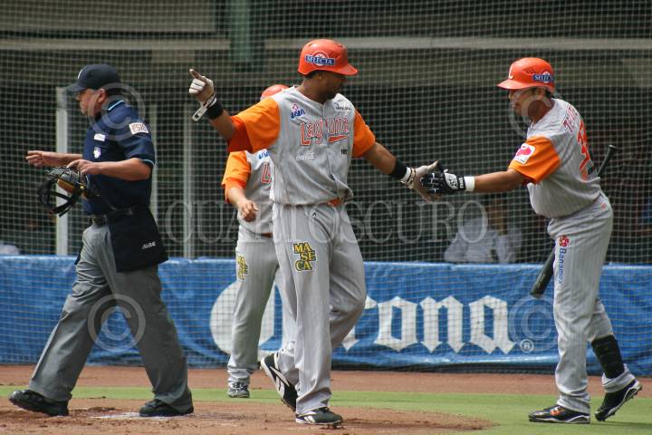 MÉXICO, D.F., 09AGOSTO2009.- Jugadores de Vaqueros Laguna celebran una de las carreras anotadas en contra de los Diablos Rojos del México, en el último partido de la serie de playoffs disputado en el Foro Sol, el cual se encuentra 14-2 en favor de los laguneros. FOTO: ISAAC ESQUIVEL/CUARTOSCURO.COM