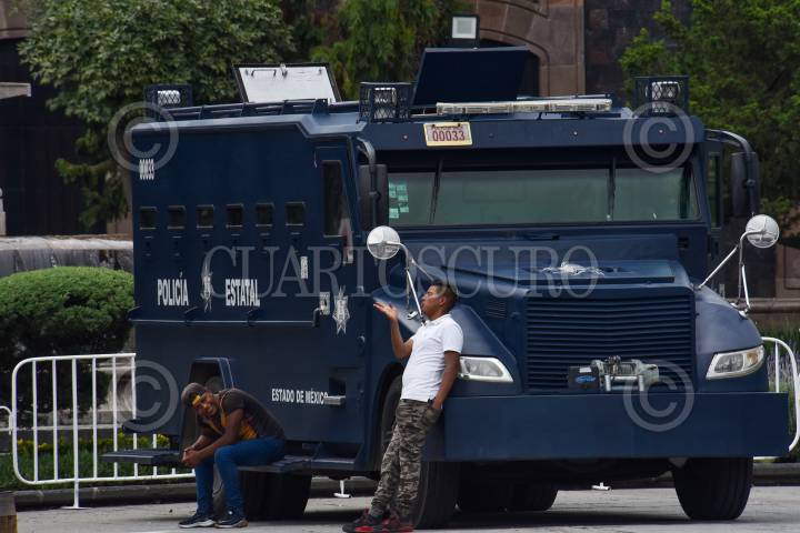 Un par de jóvenes descansa en uno se los vehículos de la SSEM instalado en la Plaza de los Mártires previo a los festejos patrios, en donde se llevará a cabo una feria de seguridad, y evitar que posibles manifestantes ocupen este espacio.