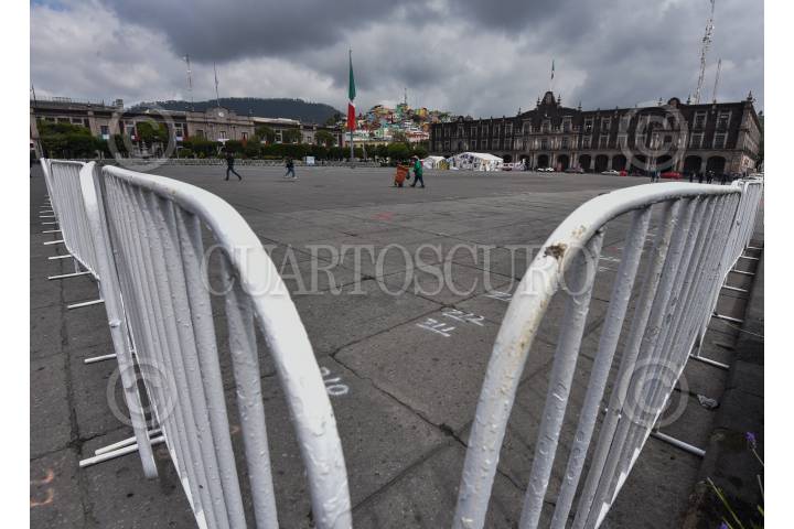 Vallas metálicas cerca la Plaza de los Mártires en Toluca para dar inicio a la obra de remodelación de este espacio público en la capital mexiquense, el cual tendrá más zonas verdes.