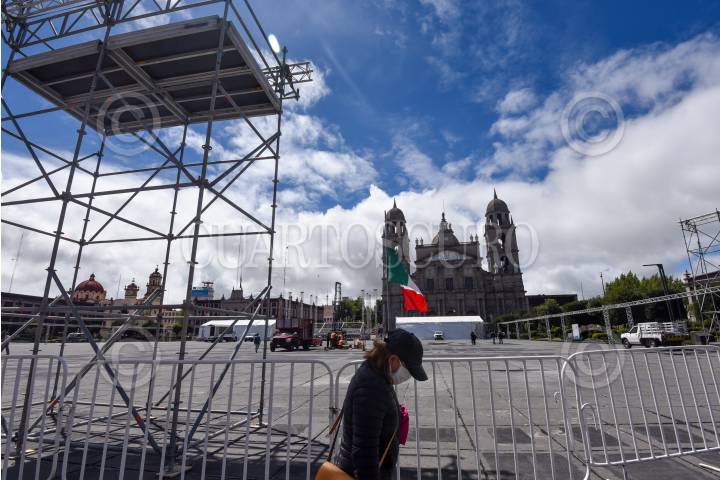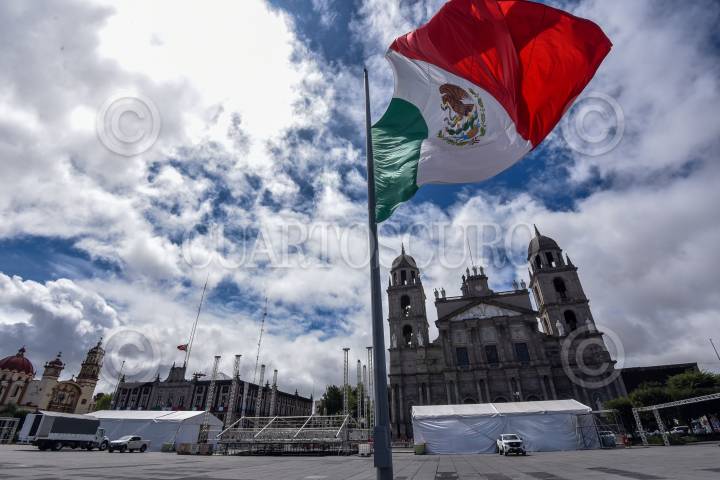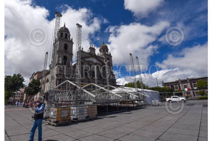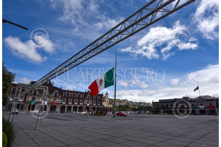 En la Plaza de los Mártires en Toluca se lleva a cabo la instalación de un escenario para los festejos del 211 Aniversario de la Independencia de México, el cual será transmitido por televisión y no tendrá público.