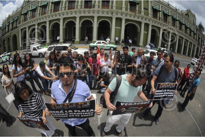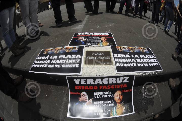 XALAPA, VERACRUZ, 28ABRIL2016.- Comunicadores colocaron nuevamente una placa con el nombre de la periodistas Regina Martínez, quien fue asesinada hace 4 años y cuyo homicidio no se ha esclarecido. Los periodistas señalaron que la Plaza Lerdo ahora se llama “Plaza Regina Martínez”, y exigieron justicia para todos los colegas asesinados en el país, pero en especial para los del estado que se siguen acumulando durante la gestión de Javier Duarte. FOTO: ALBERTO ROA /CUARTOSCURO.COM