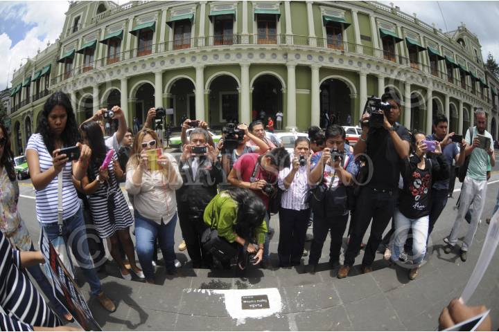 XALAPA, VERACRUZ, 09JUNIO15.- Hostigados por informantes de gobierno, periodistas de Xalapa colocaron por segunda vez en Plaza Lerdo la placa en honor a la periodista Regina Martinez, la cual ya había sido colocada el pasado el 28 de abril al cumplirse tres años del asesinato de la comunicadora y retirada el 7 de junio por desconocidos. Los periodistas recaudarán firmas para solicitar de manera formal al cabildo de Xalapa el nombramiento de Plaza Regina Martínez. FOTO: RUBÉN ESPINOSA /CUARTOSCURO.COM