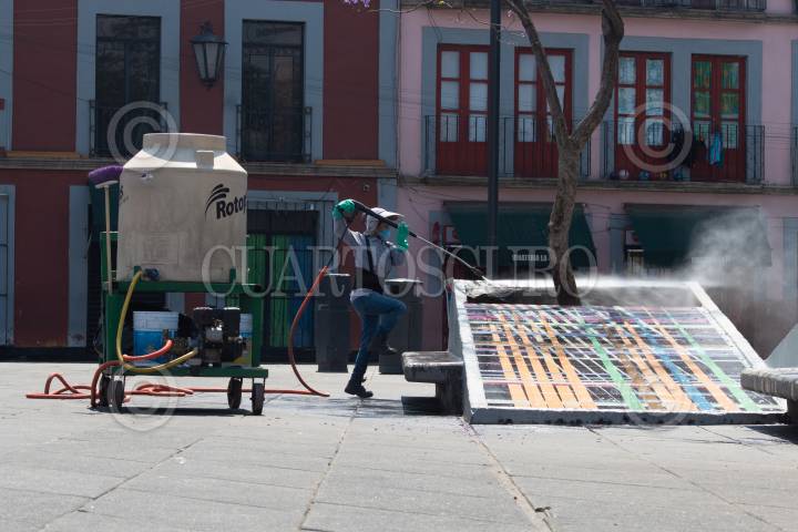 Personal de limpieza del Gobierno de la Ciudad realiza trabajos de sanitización en la plaza de Garibaldi ante la propagación por COVID-19 en el país.