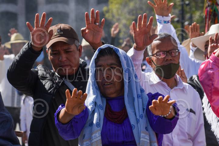 Integrantes de los Pueblos Originarios del Estado de México realizaron una ofrenda en la Plaza de los Mártires en Toluca en el marco del Día de la Dignidad y la Resistencia Indígena.