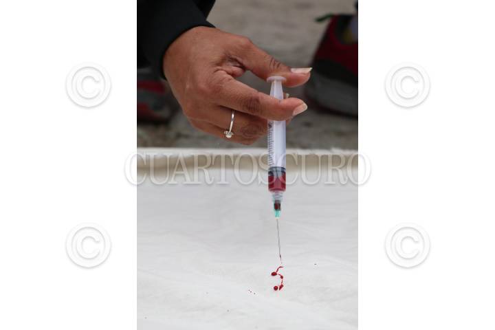 OAXACA, OAXACA, 09MAYO2018.- Saimy Pineda Velasco, quien fuera registrada por el Partido del Trabajo como candidata a la presidencia municipal de san Pedro Pochutla y después sustituida por Víctor Cruz quien busca reelegirse en el cargo, se manifestó este miércoles en la ciudad de Oaxaca al considerar que esta siendo víctima de violencia política contra las mujeres. En compañía de diversas féminas y la dirigente del Partido de Mujeres Revolucionarias (PMR), Guadalupe Díaz Pantoja se sacaron sangre y con ella pintaron diversas consignas en una manta. Pineda Velasco acusó que a Pineda Velasco y al comisionado Nacional del PT, actual senador con licencia y candidato a diputado federal, Benjamín Robles Montoya de haber falsificado documentación para reemplazarla. FOTO: ARTURO PÉREZ ALFONSO/ CUARTOSCURO.COMv