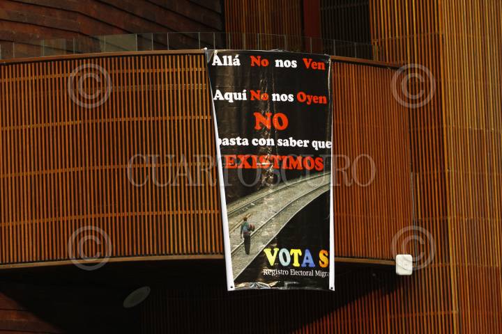 MÉXICO, D.F., 11ABRIL2012.- Una manta a favor del Registro Electoral Migrante fue colocada durante la sesión de esta mañana en el Palacio Legislativo de San Lázaro. . FOTO: ISAAC ESQUIVEL /CUARTOSCURO.COM