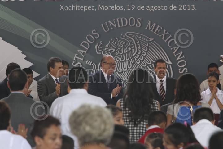 XOCHITEPEC, MORELOS, 19AGOSTO2013.- (De izq. a der., Juan Díaz de la Torre y Graco Ramírez) El presidente Enrique Peña Nieto presentó, por primera vez en su administración, la apertura del nuevo ciclo escolar 2013-2014. Alumnos de la escuela primaria Miguel Alemán en Xochitepec presenciaron el evento en donde se dieron cita el presidente nacional del SNTE, Juan Díaz de la Torre, quien refrendó su apoyo a la reforma educativa; y el gobernador del estado de Morelos, Graco Ramírez Abreu, entre demás funcionarios. FOTO: BERENICE FREGOSO / CUARTOSCURO.COM