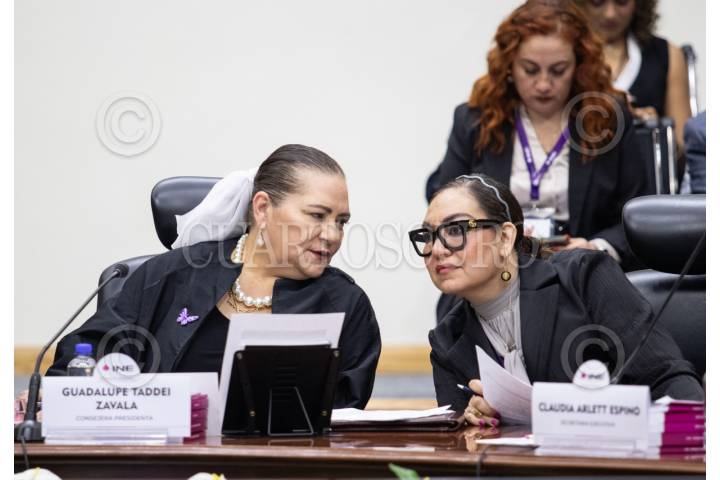 CIUDAD DE MÉXICO, 01JUNIO2025.- Guadalupe Taddei Zavala, presidenta del Instituto Nacional Electoral (INE) y Claudia Arlett Espino, secretaria ejecutiva Norma Irene de la Cruz Magaña, consejera Electoral durante Sesión del INE sobre el proceso electoral extraordinario del Poder Judicial de la Federación 2024-2025. FOTO: ANDREA MURCIA /CUARTOSCURO.COM