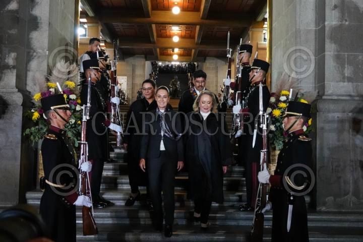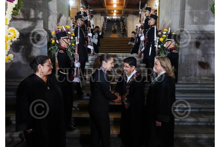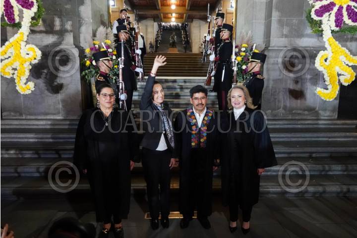 CIUDAD DE MÉXICO, 01SEPTIEMBRE2025.- La ministra Lenia Batres; la presidenta Claudia Sheinbaum Pardo, Hugo Aguilar Ortiz, ministro presidente de la Suprema Corte de Justicia de la Nación (SCJN), y la ministra Loretta Ortiz Ahlf salen tras la instalación y la apertura de puertas de la sede del Poder Judicial al pueblo.  FOTO: GALO CAÑAS/CUARTOSCURO.COM