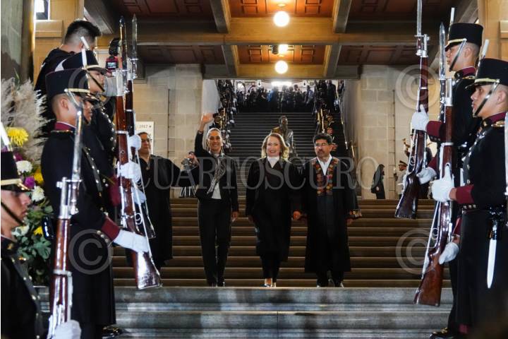 CIUDAD DE MÉXICO, 01SEPTIEMBRE2025.- La ministra Lenia Batres; Hugo Aguilar Ortiz, ministro presidente de la Suprema Corte de Justicia de la Nación (SCJN), y la ministra Loretta Ortiz Ahlf salen tras la instalación y la apertura de puertas de la sede del Poder Judicial al pueblo.  FOTO: GALO CAÑAS/CUARTOSCURO.COM
