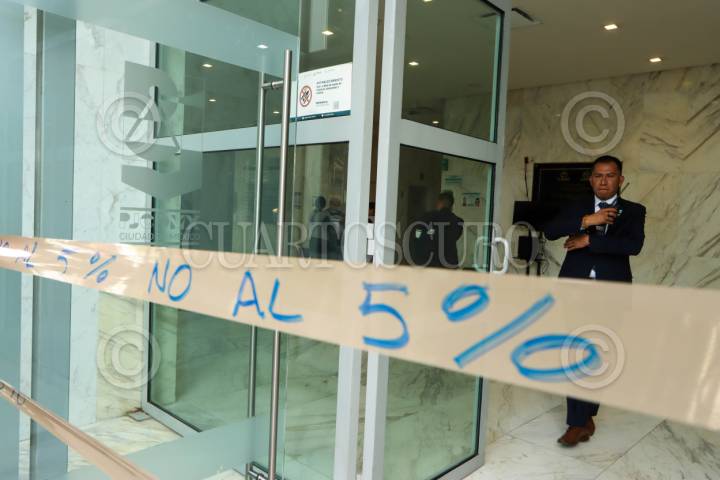 CIUDAD DE MÉXICO, 05 JUNIO 2025.- Durante un paro indefinido de actividades en la Ciudad Judicial, colonia Doctores, trabajadores del Poder Judicial colocaron una manta con la leyenda “No al 5%” para rechazar el aumento salarial ofrecido y exigir respeto a sus prestaciones. La protesta afecta los juzgados de Niños Héroes, donde los trabajadores demandan mejores condiciones laborales. FOTO: ROGELIO MORALES / CUARTOSCURO.COM
