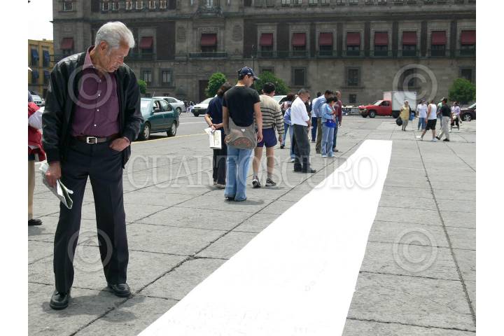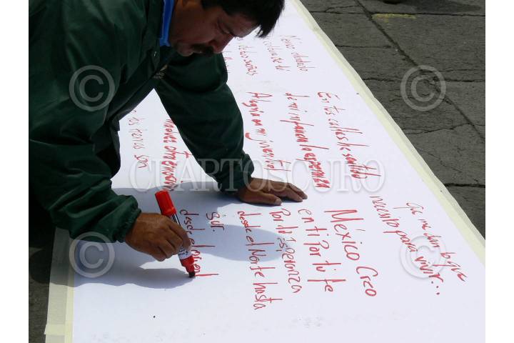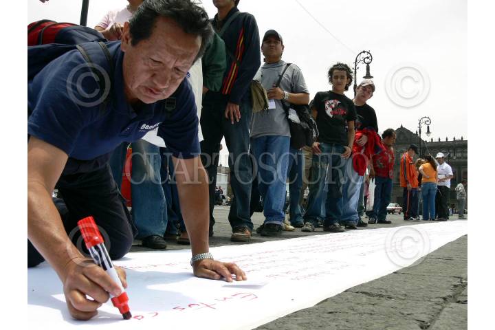 MÉXICO, D.F., 05JULIO2007.- Decenas de personas participan en la realización de un poema colectivo de 220 metros de largo en el zócalo capitalino. FOTO: PATRICIA MORALES/CUARTOSCURO.COM