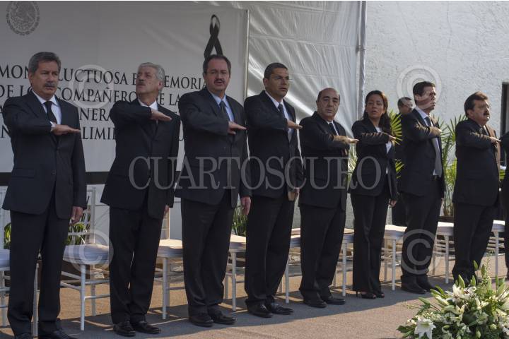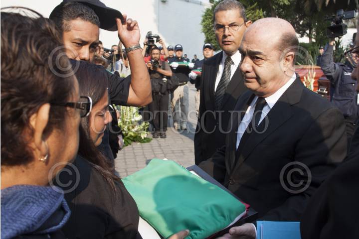MÉXICO, D.F., 04MAYO2013.- Jesús Murillo Karam, Procurador General de la República, encabezó n homenaje de cuerpo presente se les realizó a los elementos de la PGR que murieron en un accidente de avioneta el pasado martes 30 de abril en el Municipio de Morelos, en Zacatecas. La aeronave marca King Air Bimotor con matricula XC-LMV transportaba a dos agentes ministeriales, el piloto, el copiloto y un mecánico. En instalaciones de la Policía Federal Ministerial familiares, amigos y funcionarios les rindieron homenajea los caídos en el cumplimiento de su deber, la ceremonia estuvó presidida por el Procurador entregó el lábaro patrio a sus dolientes. FOTO: MOISÉS PABLO /CUARTOSCURO.COM
