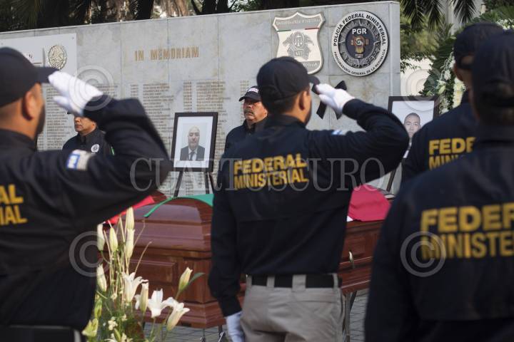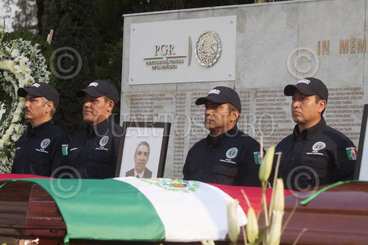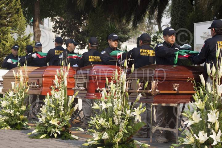 MÉXICO, D.F., 04MAYO2013.- Un homenaje de cuerpo presente se les realizó a los elementos de la PGR que murieron en un accidente de avioneta el pasado martes 30 de abril en el Municipio de Morelos, en Zacatecas. La aeronave marca King Air Bimotor con matricula XC-LMV transportaba a dos agentes ministeriales, el piloto, el copiloto y un mecánico. En instalaciones de la Policía Federal Ministerial familiares, amigos y funcionarios les rindieron homenajea los caídos en el cumplimiento de su deber, la ceremonia estuvó presidida por el Procurador General de la República Jesús Murillo Karam, quien entregó el lábaro patrio a sus dolientes. FOTO: MOISÉS PABLO /CUARTOSCURO.COM