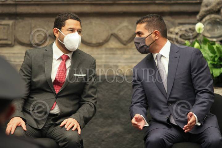 Martí Batres, secretario de Gobierno, y Omar García Harfuch, secretario de Seguridad Ciudadana, conversaron durante la ceremonia de Reconocimiento al Policía de la Ciudad de México