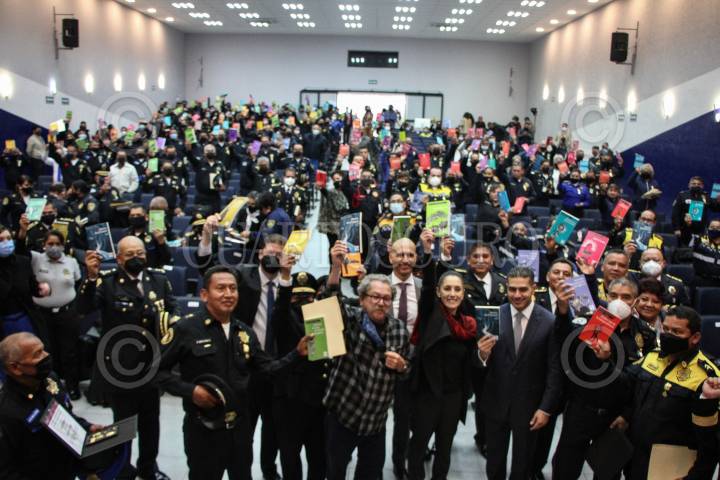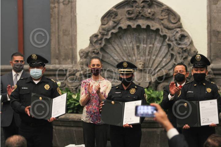 El secretario de seguridad capitalina, Omar García Harfuch y la jefa de gobierno, Claudia Sheinbaum, felicitaron a los policías graduados.