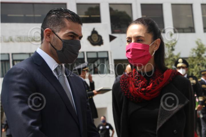 Claudia Sheinbaum y Omar García Harfuch, al interior de la Universidas de la Policía.