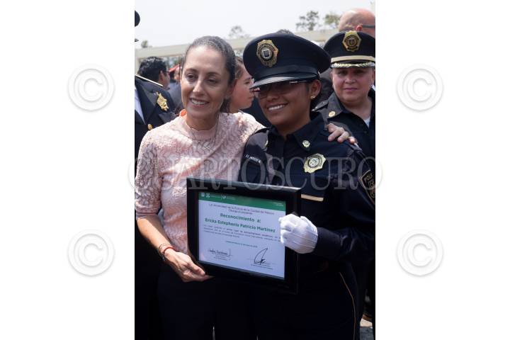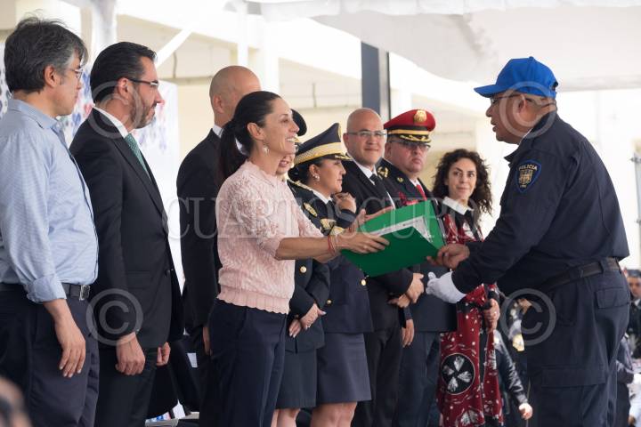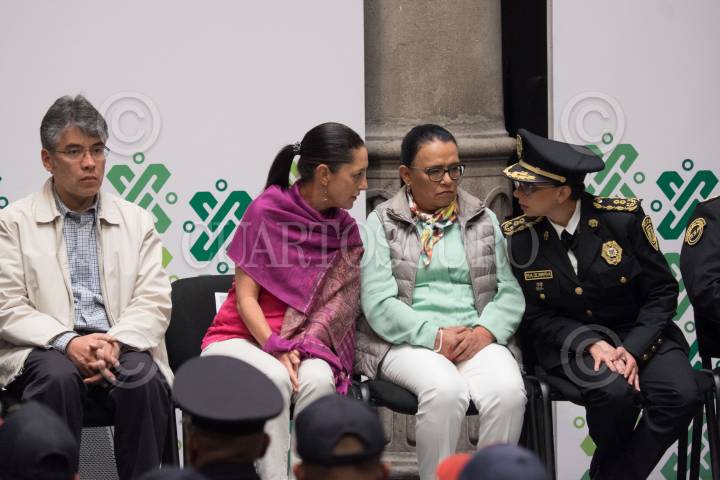 CIUDAD DE MÉXICO, 10MARZO2019.- Ernestina Godoy, procuradora de Justicia, Jesús Orta Martínez, titular de la Secretaria de Seguridad Pública, Claudia Sheinbaum, jefa de Gobierno, Rosa Icela Rodríguez, secretaria de Gobierno y Salvador Guerrero Chitres, presidente del Consejo Ciudadano le entregaron un reconocimiento a Eduardo Mondragón García, Policía del Mes, en el Parque Bicentenario de la alcaldía Miguel Hidalgo. FOTO: GUADALUPE HERRERA / CUARTOSCURO.COM