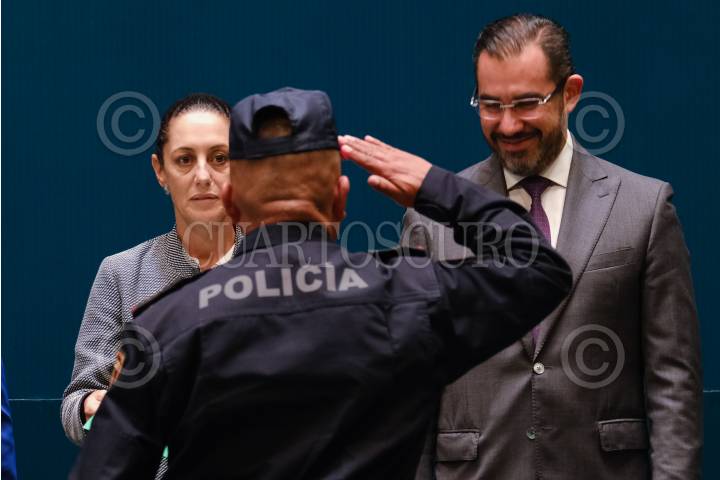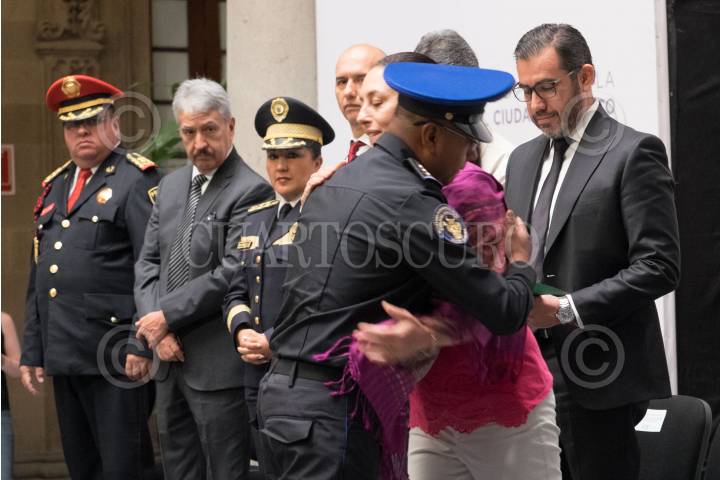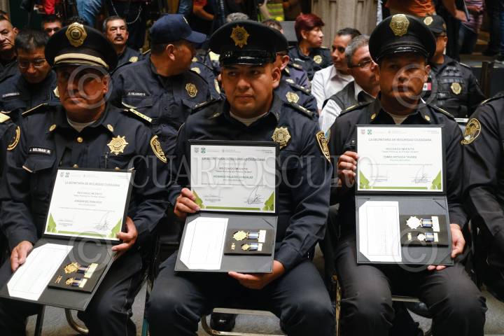 CIUDAD DE MÉXICO, 02SEPTIEMBRE2019.- Claudia Sheinbaum, jefa de Gobierno, y Jesús Orta Martínez, secretario de Seguridad Ciudadana, durante la ceremonia del Policía del Mes Escuadrón de Rescate y Urgencias Médicas (ERUM) y condecoraciones 2019, el cual se realizó en el Antiguo Palacio del Ayuntamiento. FOTO: GRACIELA LÓPEZ /CUARTOSCURO.COM